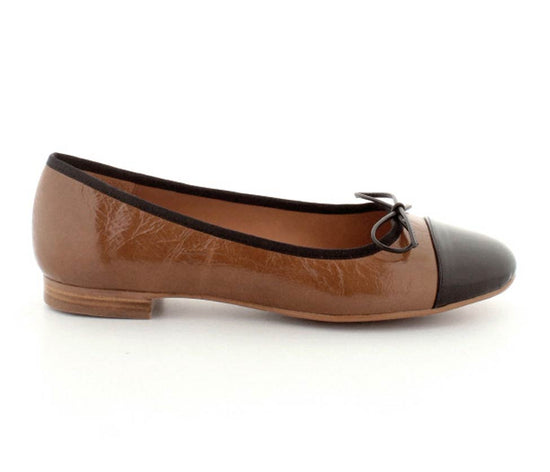 Super fine ballerinaer fra Billi Bi i cognacfarvet skind med sort snude og sløjfe. Skindet har en "krøllet lak" og fint sort kantbånd rundt. Der er de blødeste skindsåler indeni og fleksible såler under bunden.