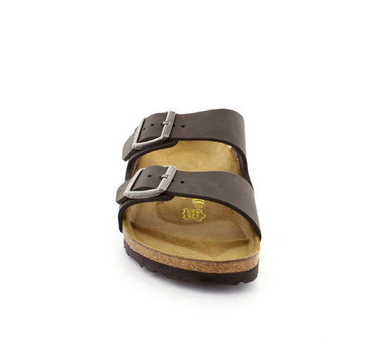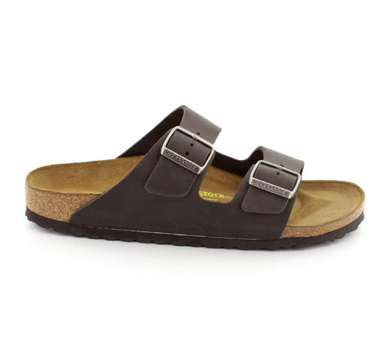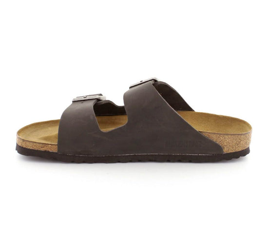 Smart og klassisk sandal slippers fra Birkenstock model Arizona i sort oilieret skind. Sandalen har et godt hold på foden, da de to remme sidder godt op på vristen og kan justeres efter fodens bredde med spænde. Sandalen er lavet med korksåler, som er et naturmateriale der kun bliver blødere med tiden. Der er ruskinds dæksåler indeni, der er formet anatomisk efter foden. Under bunden har Birkenstock sandalen EVA såler, der er lette og stødabsoberende. Husk sandalen er lidt til den store side og er med "narrow fit"