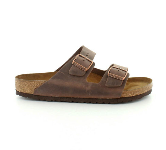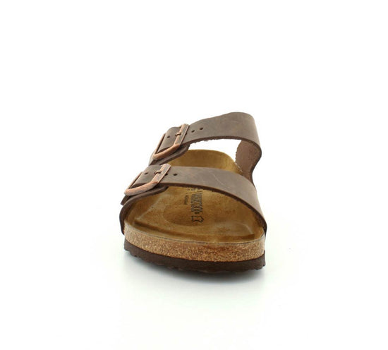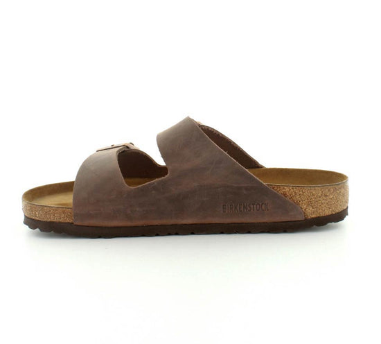 Smarte sandal slippers fra Birkenstock model Arizona med "regular fit". Sandalen er lavet i den mørkebrune farve og i oilieret skind. Der er to regulerbare remme og en god bred sål at gå på. Der er ruskind i bunden, med biosåler, så der er ekstra svang og støtte ved forfoden. Sandalen fra Birkenstock er stor i størrelsen og rummer godt i bredden.