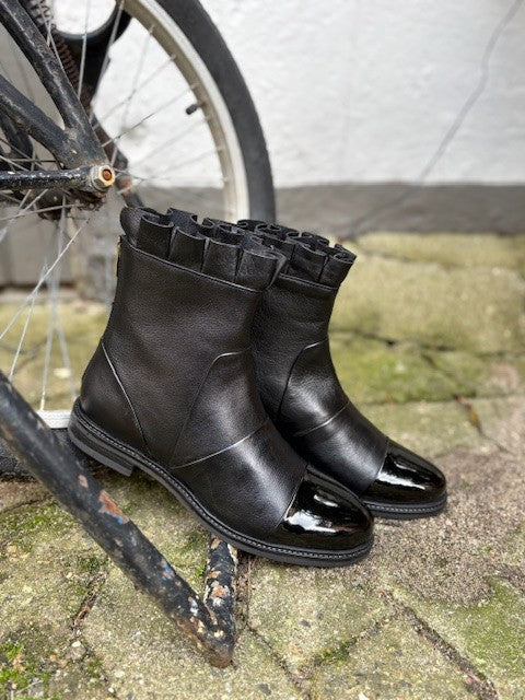 Flotte og elegante støvletter fra Copenhagen Shoes model Margaret. Støvlen er lavet i glat skind med flæsekant i toppen og lynlås bagpå. Bløde fleksible gummisåler under hele bunden. Fin lille sort laksnude.