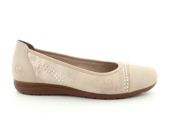 Smarte lyse ballerinaer fra Rieker. God plads i bredden og bløde gummisåler under bunden.