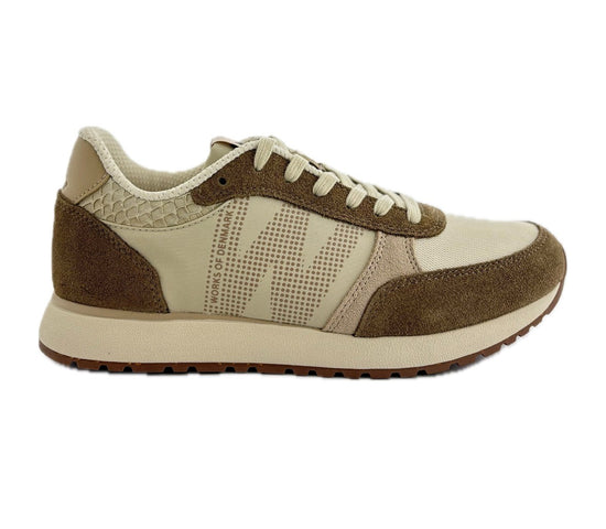 Ronja sneakers fra Woden i flotte brune og lyse nuancher. Der er snørebånd, aftagelige korksåler, og dejlig bløde stødabsoberende såler med gummi under hele bunden.