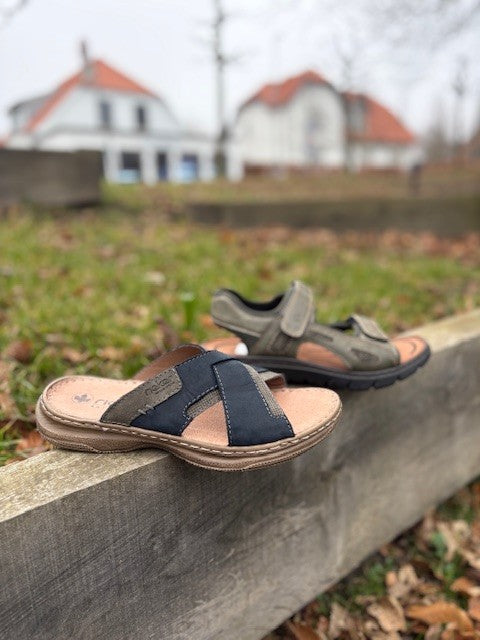 Smarte og klassiske slippers fra Rieker i mørkeblåt ruskind. Der er to store krydsremme, så den rummer godt og er lige til at smutte i. Bløde skindsåler med antistress, så de er dejlige at gå på.