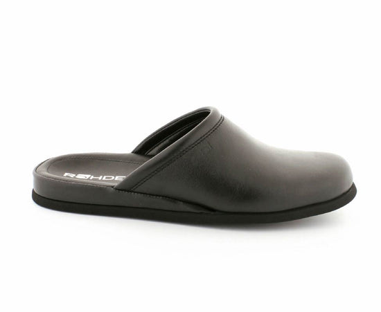 Flot klassisk hjemmesko fra Rohde i sort glat skind. Hjemmeskoen er lige til at smutte i og er meget let. Har et godt hold på foden da stykket foran går godt op på vristen. Bløde fleksible såler i et EVA materiale.