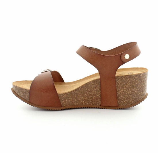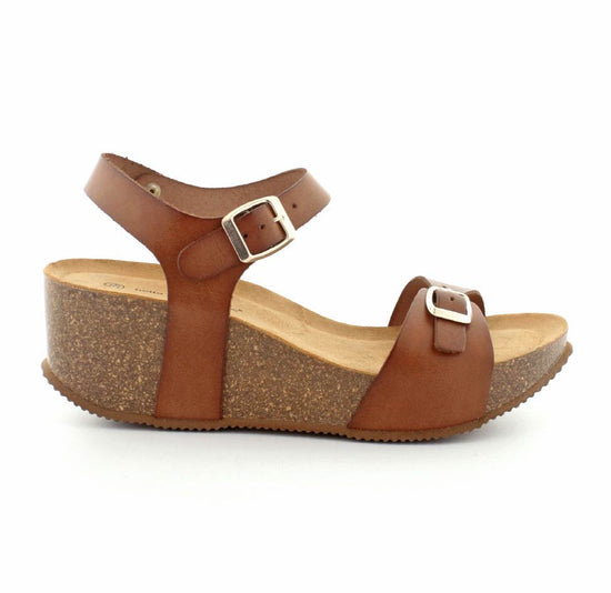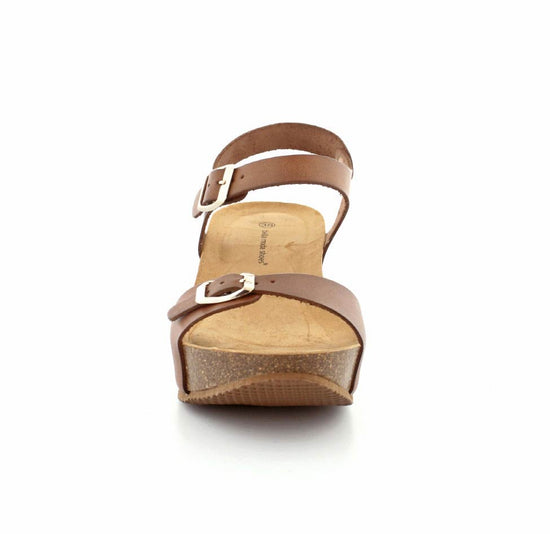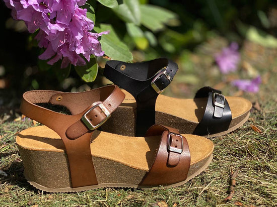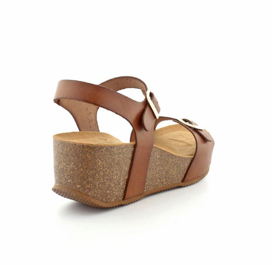 Lækre wedges fra Bella Moda i cognacfarvet skind med guldspænder på. De to spænder kan reguleres efter fodens bredde, så næsten alle fødder kan passe dem. Der er et godt hold på foden og sålen er meget nem at gå på, da der er plateau under forfoden. Blød og lækker.