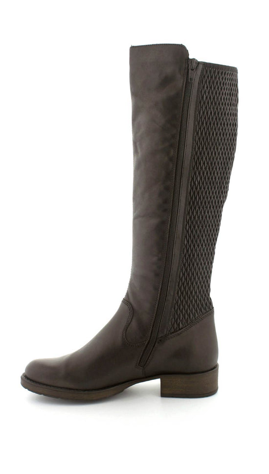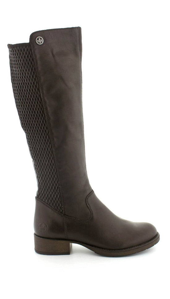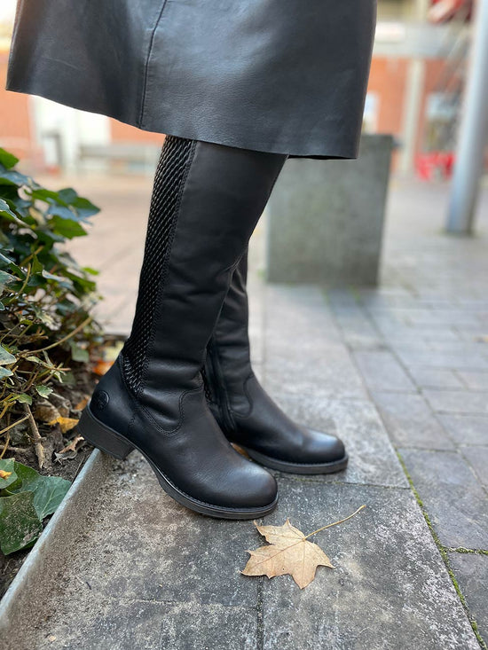Super lækker langskaftet støvle fra Rieker i sort glat skind. Smart detalje med to brede elastikkiler på skaftet, så støvlen kan tilpasses benets bredde. Der er lynlås på indersiden og blødt microfiberfoer indeni. Støvlen fra Rieker har en god bred blokhæl og gode solide og fleksible gummisåler under hele bunden.