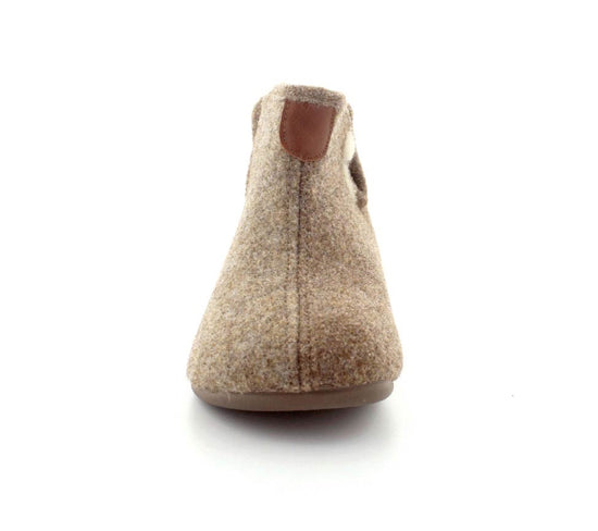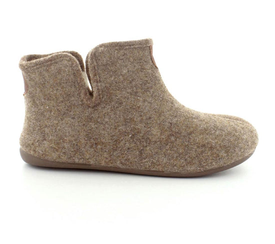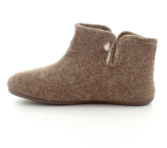 Skønne hjemmesko fra Bella Moda i en flot lys brun farve. Skoen er lavet i filt med rigtig uldfoer indeni. Nem at trække på og god bred i foden. Der er bløde og fleksible gummisåler under hele bunden.