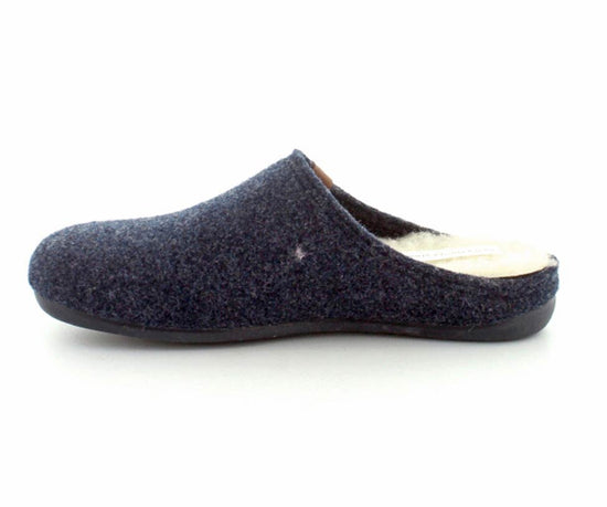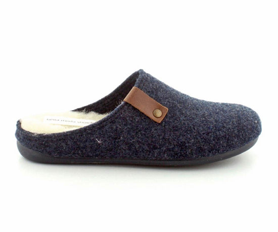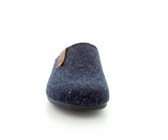 Hjemmesko i mørkeblå uldfilt fra Bella Moda med en smart brun skinddetalje på. Skoen er en slippers lige til at stikke i med lækkert uldfoer indeni. Der er bløde fleksible gummisåler under hele bunden og skoen er løftet i hælen.