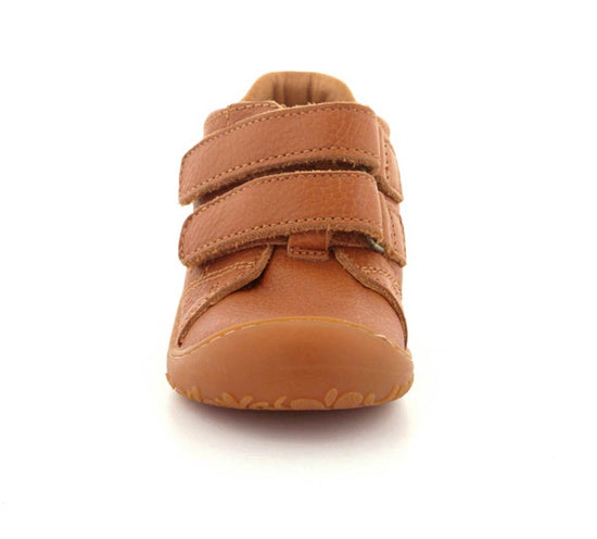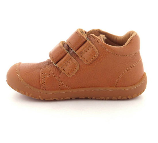 Rigtig god startersko fra Bisgaard model Barefoot i cognac farvet skind. Skoen har god fast hælkappe, to regulerbare velcroremme og går godt op og støtter barnets fod. Der er gummisåler under hele bunden og op om snuden for at beskytte skoen og foden. Skindfoer indeni og aftagelifge såler. Bløde fleksible gummisåler under bunden.