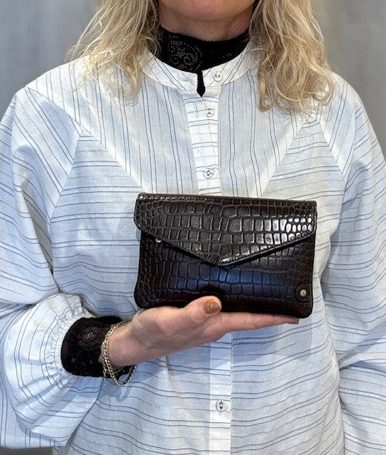 Flot stor pung i crocopræget skind. Pungen har flere rum og kan også rumme en mobil. Der er lavet en strop bagpå, så man kan sætte den fast i bæltet.