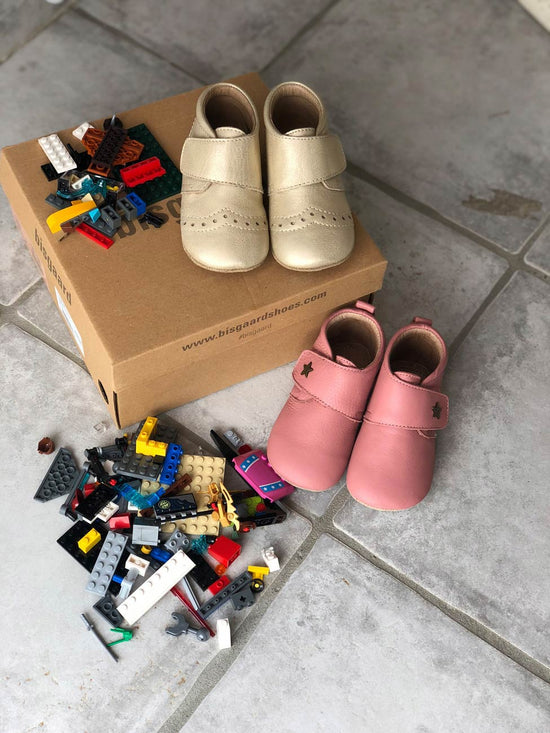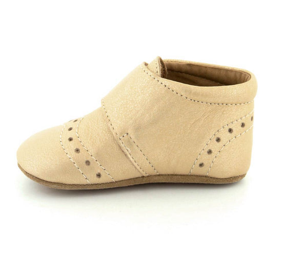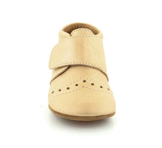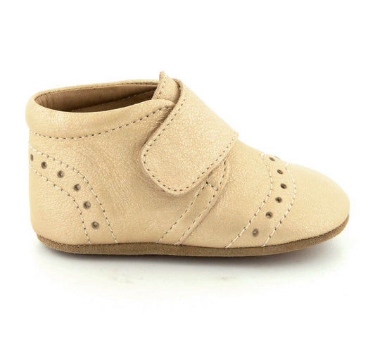 Super fin prewalker fra Bisgaard model Petit i mat guldfarvet skind til indebrug. Skoen er rigtig god at lære at gå og kravle i, da den støtter barnets fod godt. Der er fast hælkappe, regulerbar velcrorem og skindfoer i hele skoen. Under bunden er der ruskindssåler med gummifelter på, så barnet står bedre fast. Hjemmeskoen fra Bisgaard rummer godt i bredden og er stor i størrelsen.