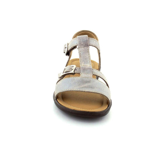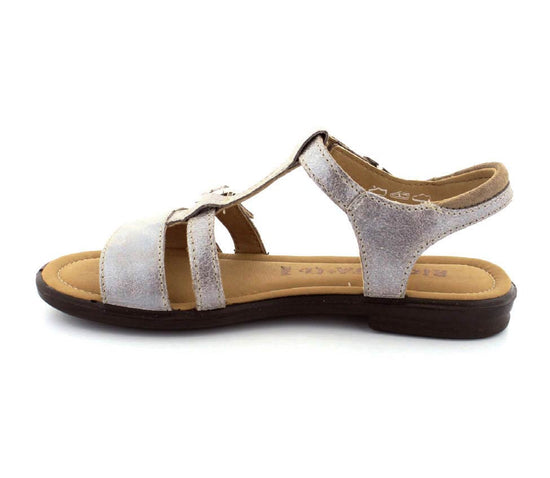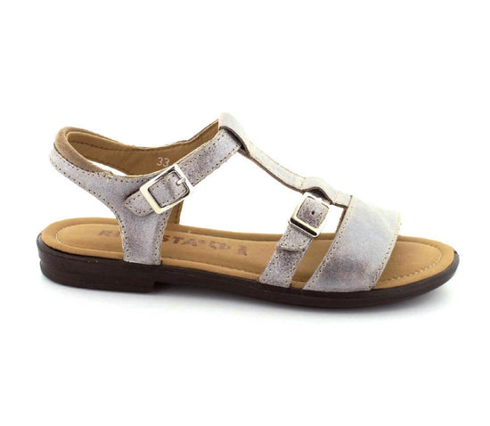 Super fin sandal fra Ricosta model Kalja og sølvfarvet rustikt skind. Sadalen er lavet på en smal læst så den sidder rigtig godt på en smal og normal fod. Den kan reguleres ved spændet på forfoden og ved velcro på ankelremmen. Alt er lavet i skind, så den er blød og lækker at have på. Sålerne er meget lette, fleksible og stødabsoberende. Super sandal til skolepigerne.