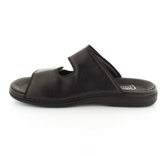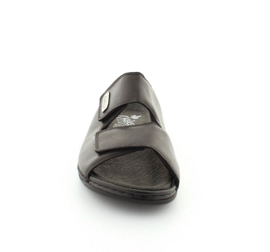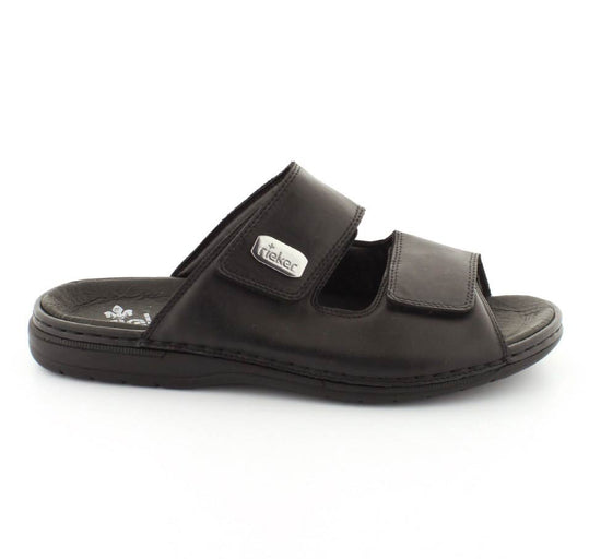 Rigtig lækker herresandal fra Rieker i sort blødt skind. Sandalen er med to justerbare velcroremme, så de kan passe foden både med strømper på og i bare fødder. Skindet er meget blødt og sålen indeni giver efter og er meget blød. Sandalen fra Rieker har god støtte på begge sider, da den lukker til på siderne af foden. Stødabsoberende og fleksible såler. Sandalen fra Rieker egner sig også rigtig godt som hjemmesko.