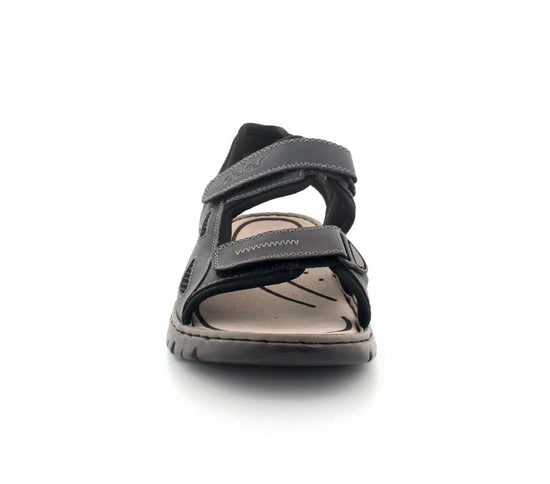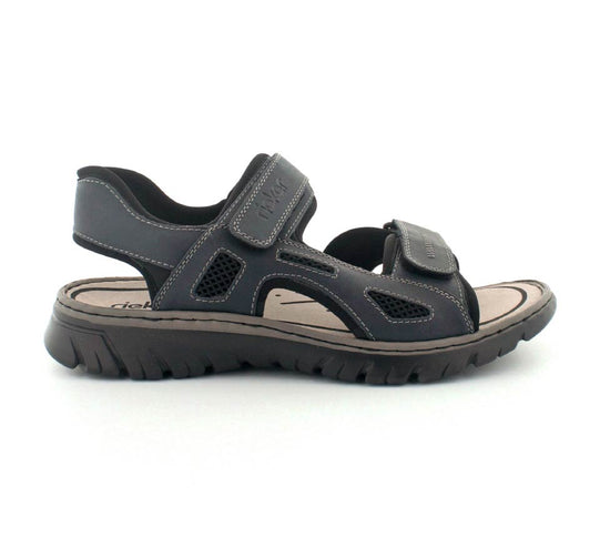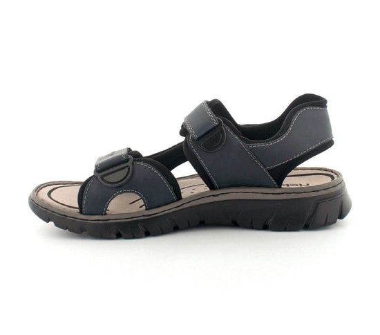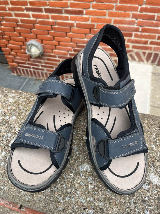 Rigtig god trekking sandal fra Rieker i mørkeblå imiteret skind. Der er et super godt hold på foden og den rummer godt i bredden. Kan justeres med to regulerbare velcroremme. Bløde ruskindssåler indeni.