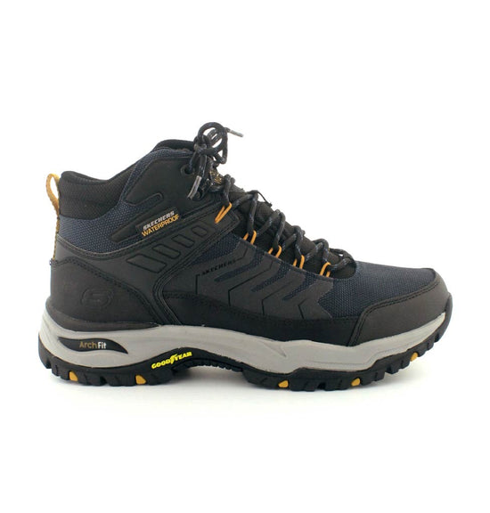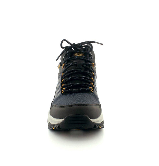 Rigtig god vinterstøvle og vandrestøvle fra Skechers model Arch Fit Dawson. Støvlen er en snørestøvle i mørkeblå tekstil med sorte detaljer på. Der er et super godt hold i støvlen, så den støtter fod og ankel godt. Støvlen er med tex membran, så den er vandtæt, og der er gode solide gummisåler (GoodYear) med god profil. Aftagelig indlægssåler med ekstra svangstøtte.