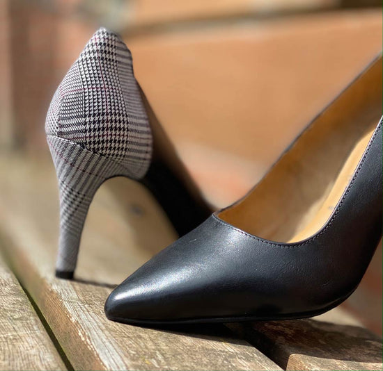 Flot og elegant pump fra Tamaris i sort glat skind med tern på bagkappe og stilethæl. Skoen er med spids snude og tynd stilethæl. Skoen fra Tamaris har skinddækssål indeni med "Touch It" som er en blød sål der former sig efter foden. Glatte såler under bunden som er fleksible.