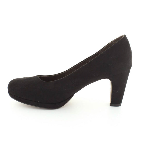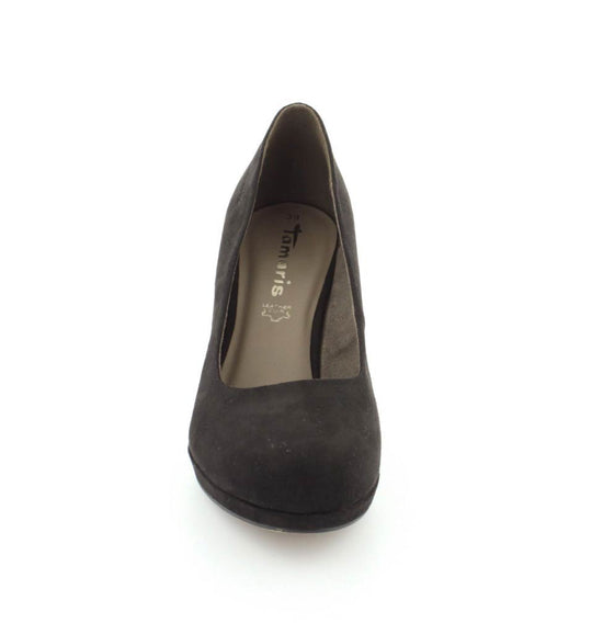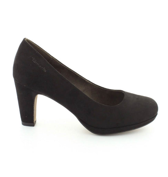Klassisk pump fra Tamaris i sort tekstil. Skoen er med høj hæl på 8 cm og et plateau på 1 cm under forfoden. Der er skind dæksåler indeni og god fast hælkappe.