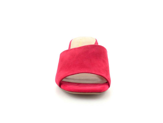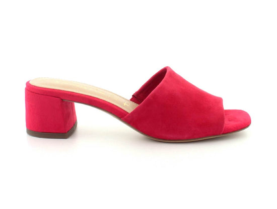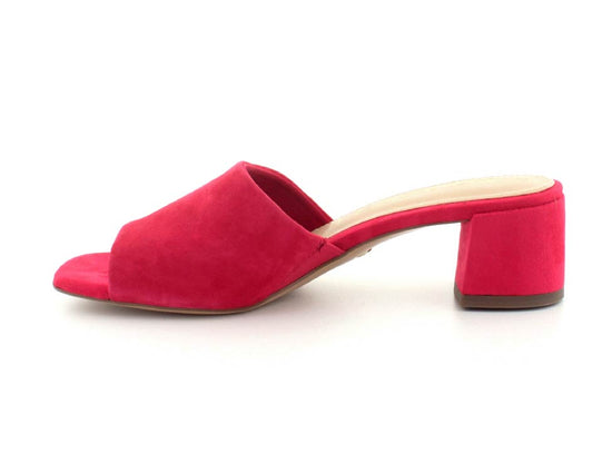 Smuk slippers med hæl fra Tamaris i ruskind og i en flot fuxia/pink farve. Sandalen har en god bred rem ved forfoden, der dækker flot ind og som rummer godt. Bløde skindsåler indeni og en nem blokhæl at gå på. Den har både "AntiSlide" og "AntiShokk"