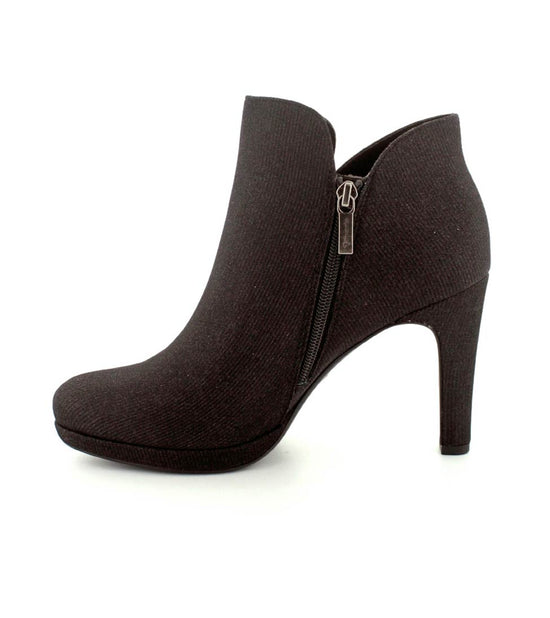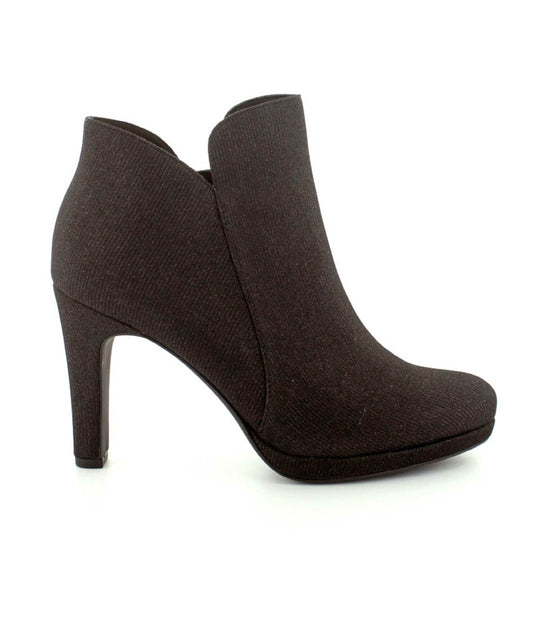 Flotte og elegante støvletter fra Tamaris i et sort glimmer materiale. Støvlen er med en bred stilet og plateau under forfoden, så den er nemmere at gå på. Lynlås på indersiden og en flot skæring i toppen. Super fest støvle.