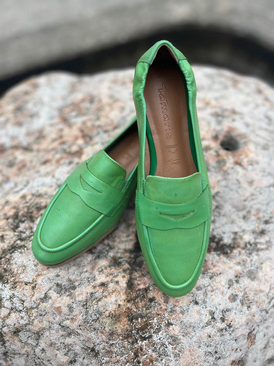 Super flotte grønne skind loafers fra Tamaris i lækkert blødt skind. Skoene er elegante i udtrykket og har helt flade såler. Indnei er der bløde skindsåler med "Touch It" der former sig efter foden.