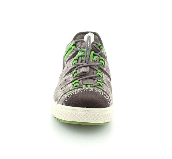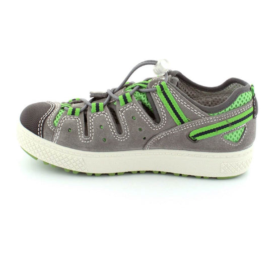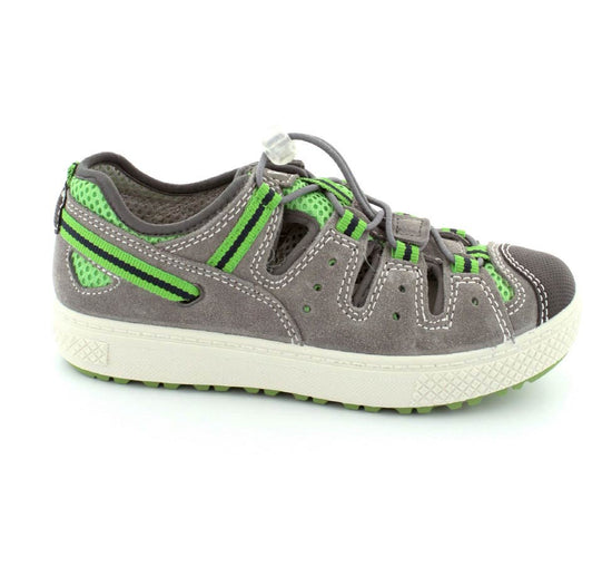 Smart sko til de drenge der ikke vil have sandaler. Skoen er fra Primigi model Dafydd og lavet i en kombination af gråt ruskind med grønne detaljer på. Skoen er med elastiklukning, så den er nem at tage på. Lufthuller til foden og aftagelige skinddæksåler indeni. Skoen fra Primigi er meget let og har bløde fleksible og stødabsoberende såler under bunden.