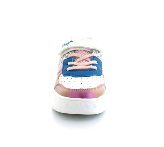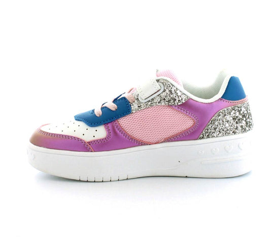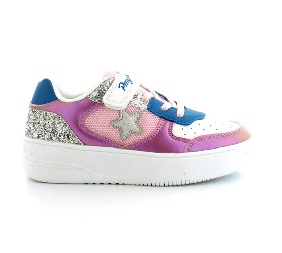 Super smarte sneaks fra Primigi i flotte farver og med glimmer på. Enhver piges drøm. Skoen er lavet i imiteret skind og med plateau såler i gummi. Nem at komme i med regulebar velcrorem og elastiksnøre. Passer til en almindelig og en bred fod.