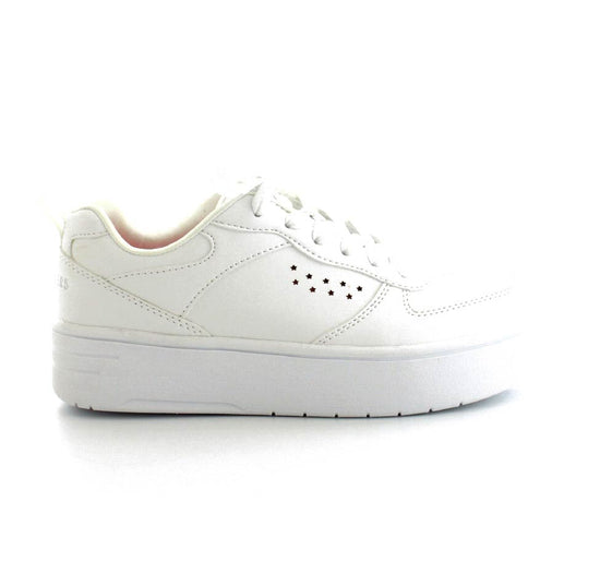 Super flotte hvide sneaks fra Skechers model Court High Color Zone. Skoen er en hvid snøresko helt enkelt i looket. Meget lette og stødabsoberende såler. Husk den er stor i størrelsen.