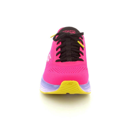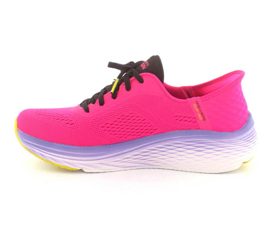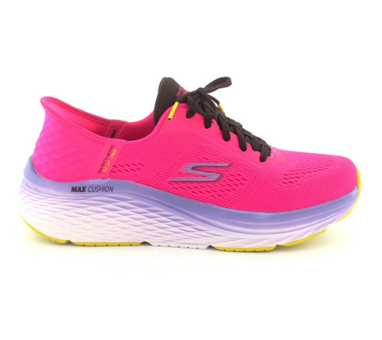 Super smarte pink Skechers model Slip-ins Max Cushioning. Skoen er en snøresko, men den har den smarte hælkappe, hvor man bare kan glide ind i den uden at snøre op. Så den kan tilpasses fodens bredde og så derefter bare glide i den. Skoen er med så godt stødabsobering at man kan bruge den som træningssko og løbesko. Husk den er rummelig og stor i størrelsen, så gå gerne en størrelse ned.