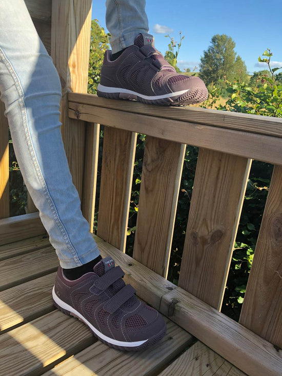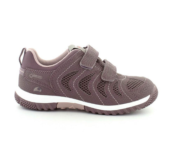 Super god kondisko fra Viking model Cascade GTX. Skoen er i en flot lilla farve med to regulerbare velcroremme. Der er god fast hælkappe, forstærkning i snuden, god bredde til foden, solide gummisåler under hele bunden og aftagelige indlægssåler. Derudover er den med Gore-Tex membran, så den også er 100% vandtæt og åndbar. Kort sagt en rigtig tonsersko. Skoen kan også vaskes på 30 grader skåne vask.