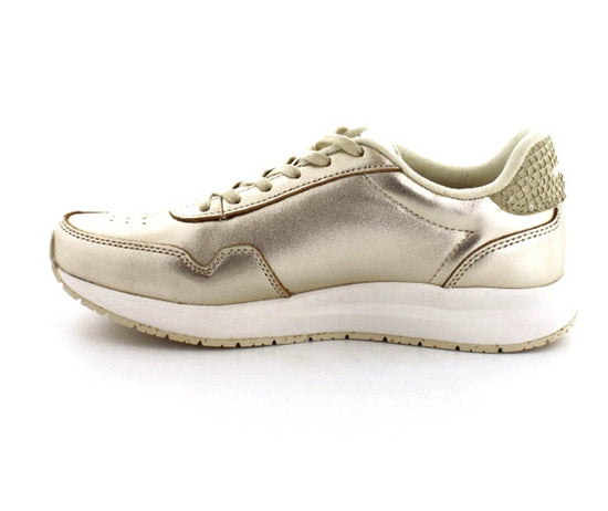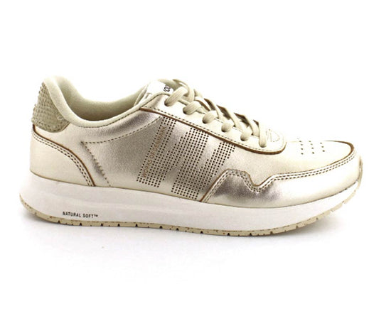 Super flotte guld sneakers i skind fra Woden model Nora. Skoen er en snøresko med Natural Soft såler, der er meget stødabsoberende. Aftagelige korksåler med ekstra svangstøtte. Gummisåler under hele bunden lavet med genbrugsgummi,