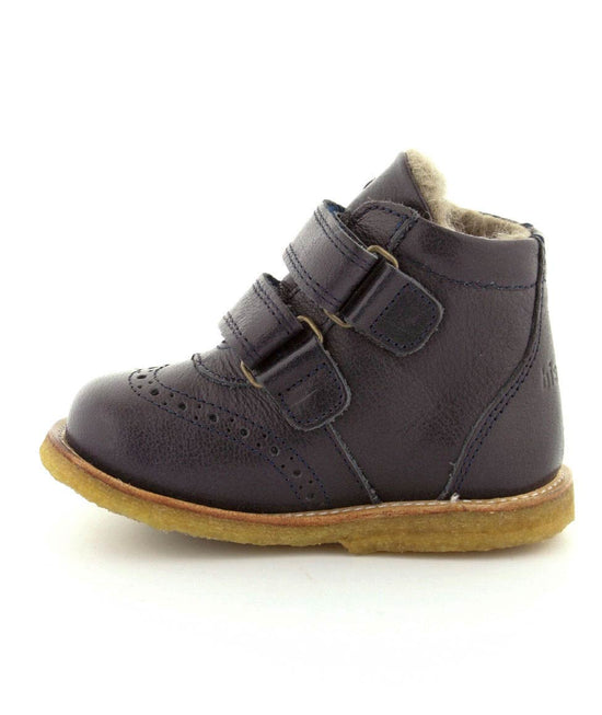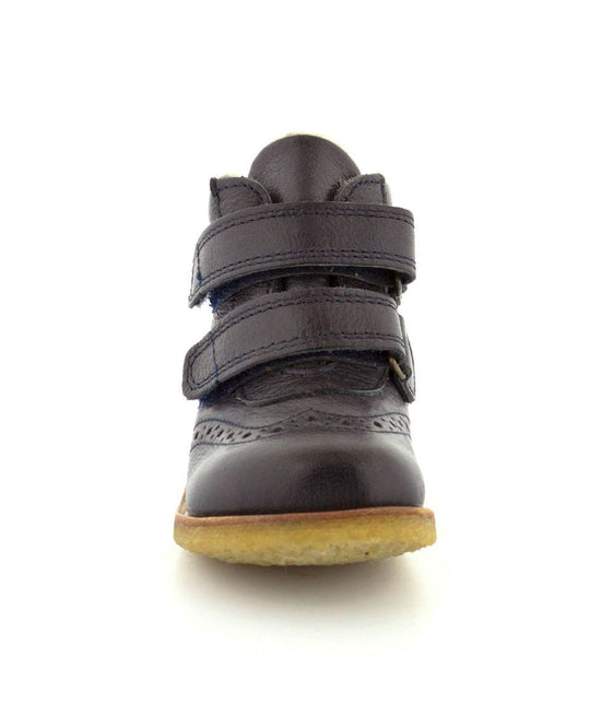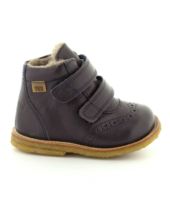 Super lækker vinterstøvle fra Bisgaard til de mindste. Støvlen er lavet i mørkeblåt skind med golfstikninger på snuden. Det er en lille kort model, der passer godt som en af de første vinterstøvler. Den er nem at komme i med to regulerbare velcroremme, har god fast hælkappe og støtter barnets fod godt. Støvlen fra Bisgaard er varmtfoeret med rigtig uld, og har Tex membran, så den kan klare sne og kulde. Der er bløde fleksible rågummisåler under hele bunden.