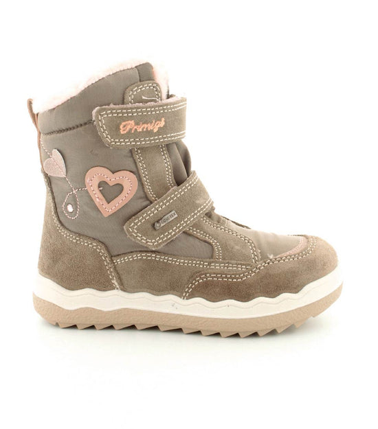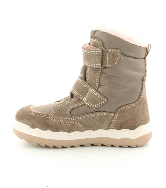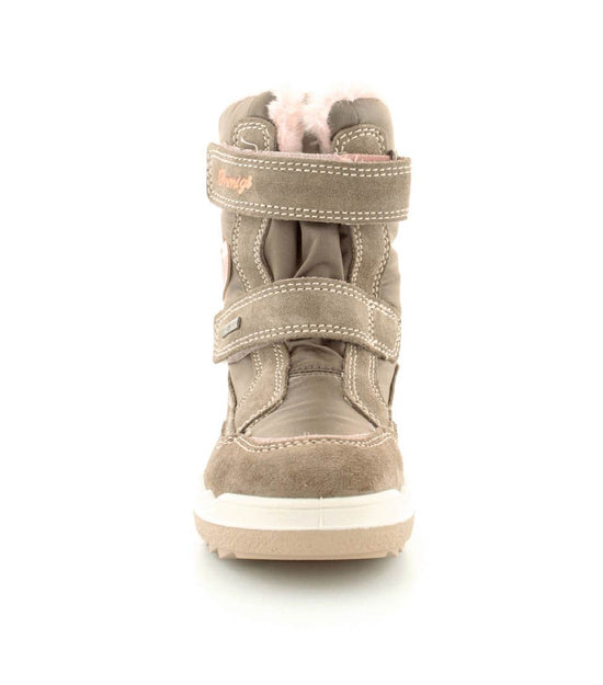 Super god vinterstøvle fra Primigi model Frozen GTX. Støvlen er en rigtig vinterstøvle med varmt foer og Gore-Tex membran, så den er 100% vandtæt. Det er en let og stødabsoberende støvle, der er nem at komme i med to regulerbare velcroremme. Flot lysbrun farve med rosa detaljer på.