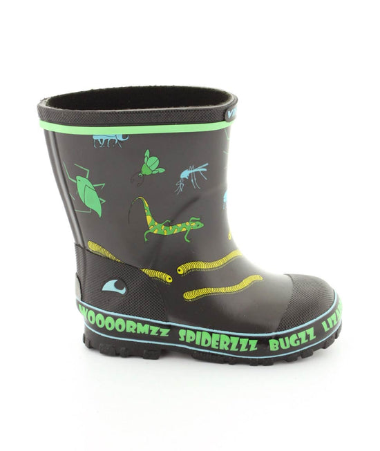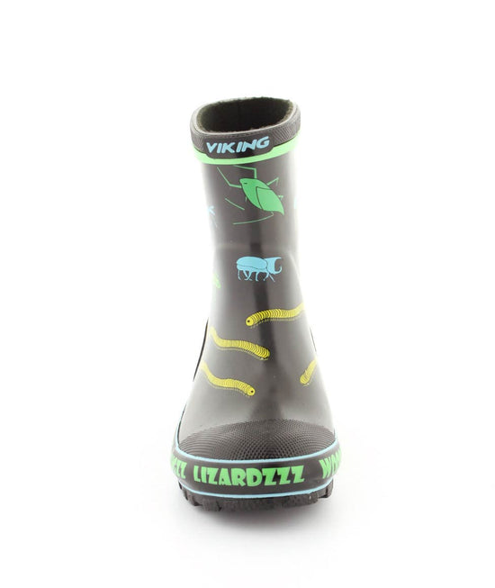 Rigtig fed gummistøvle til drenge fra Viking. Gummistøvlen er grå med motiver af forskellige insekter. Den er lavet i blødt naturgummi og sålerne er meget bløde og fleksible. Gummistøvlen fra Viking har en rigtig god pasform og sidder godt til om barnets fod. Støvlen er hverken for lang til barnet eller for kort.