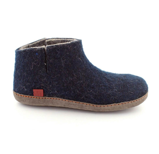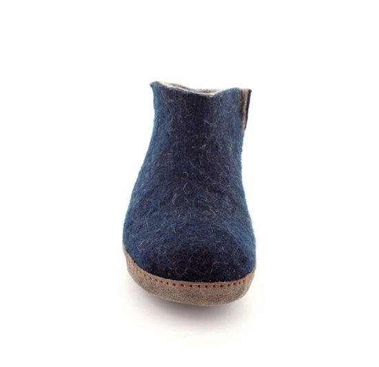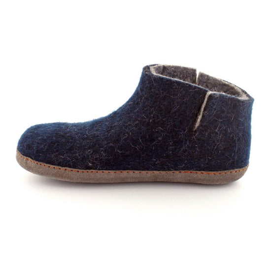 Super smarte hjemmesko fra Green Comfort i mørkeblåt uld. Modellen er en sokkemodel, så den er lige til at trække på. Der er en slids på hver side, så den rummer godt. Blå udenpå og grå indeni. Skoen er lavet i 100% uld og lavet i hånden i Indien. Der er et mærke på hver sko, så man kan se hvem der har lavet dem. Skoen fra Green Comfort er dejlig blød at have på, da der under uldsålen er en EnergySole der former sig efter foden og som er stødabsoberende. Under bunden er der en ruskindssål. Den er lidt til den lille side.