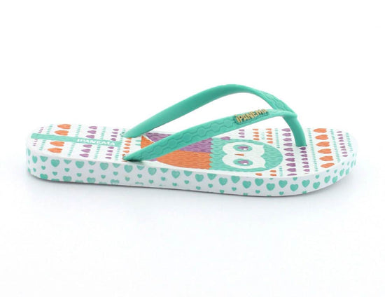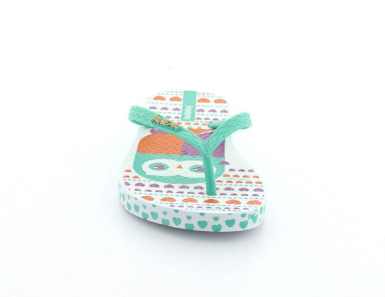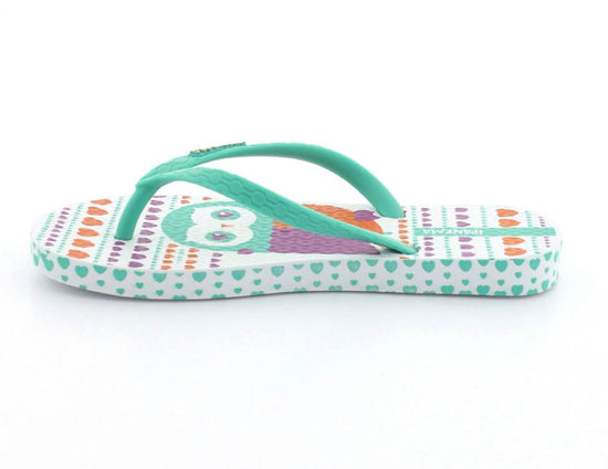 Super fine klip klap fra Ipanema med ugler. Den højre sandal har en stor ugle og masser af forskellige hjerter i bunden, hvor den venstre sandal kun har små ugler i bunden. Tåremmen har en flot mint grøn farve. Bløde og fleksible såler, der er stødabsoberende under hele bunden. Sandalen fra Ipanema er lille i størrelsen.